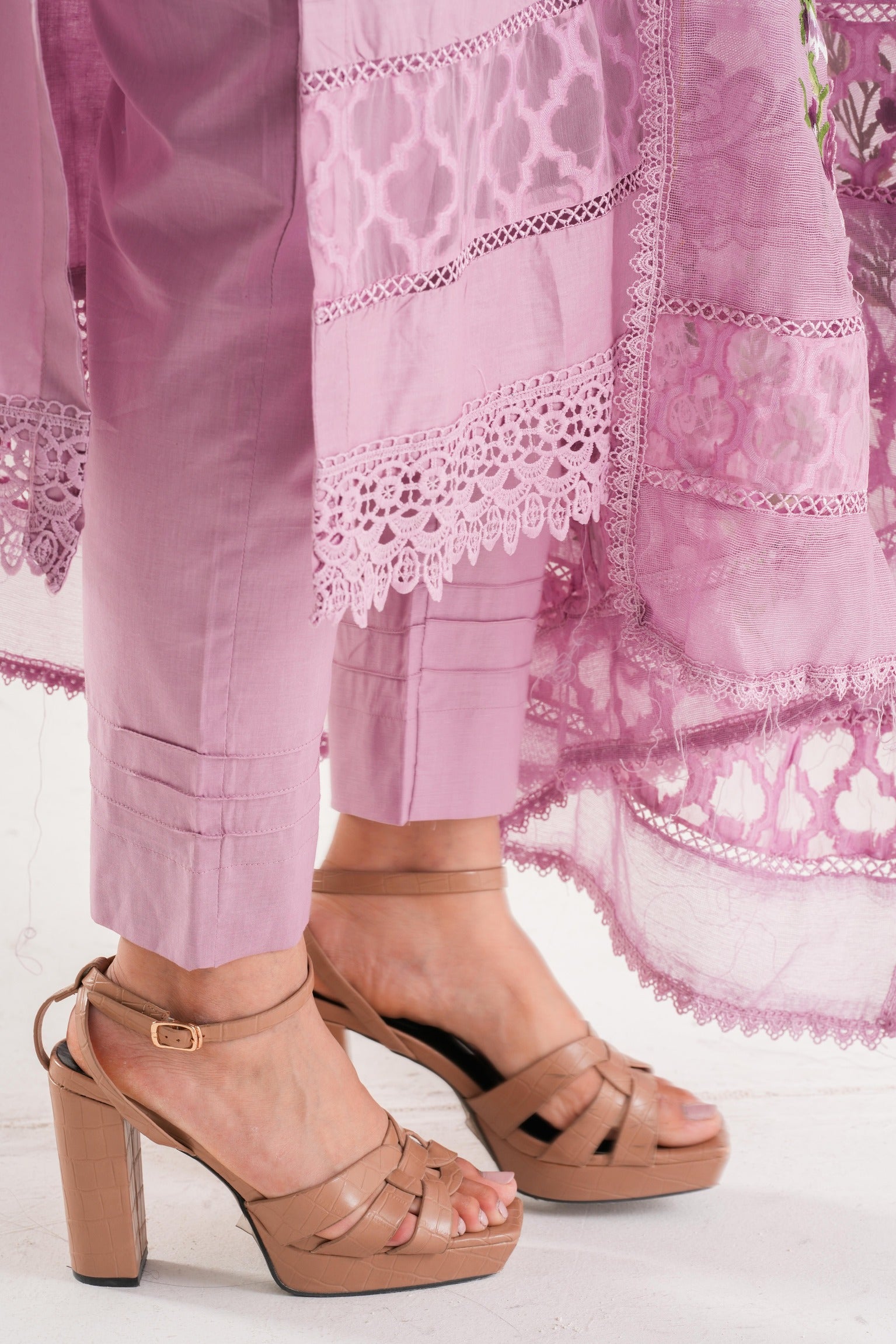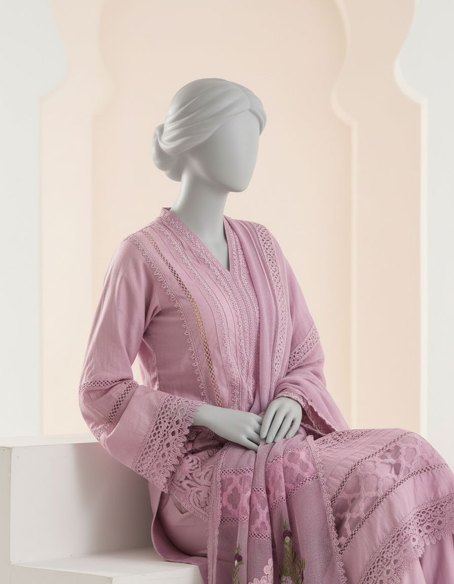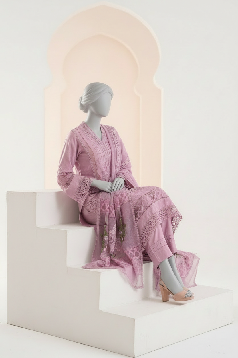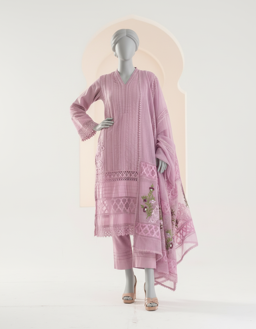 Step into the festive season with this exquisite cotton-net dress, available in soft lilac shades. Crafted with precision and care, the outfit is fully embellished, showcasing intricate threadwork, delicate sequins, and subtle accents that catch the light beautifully.