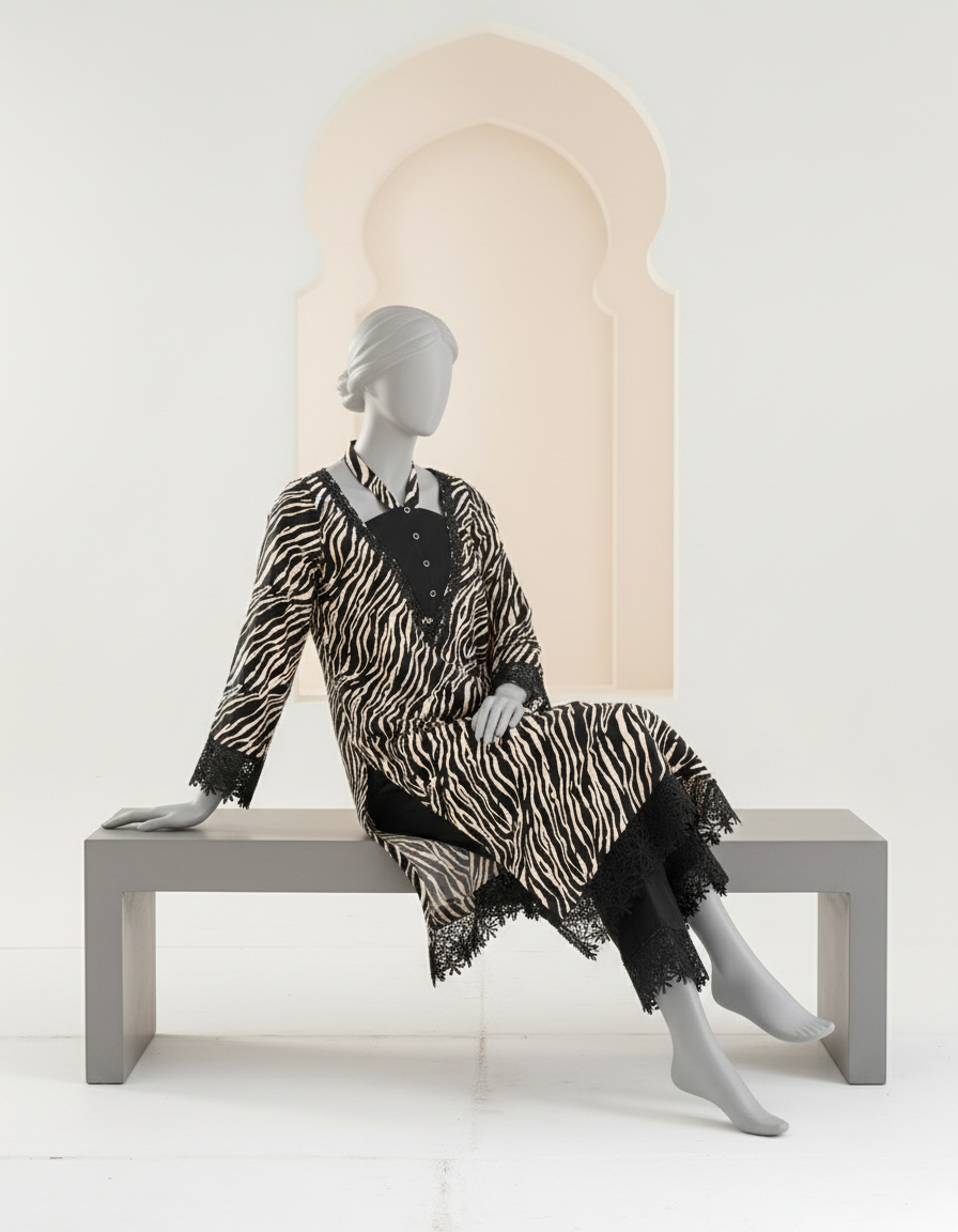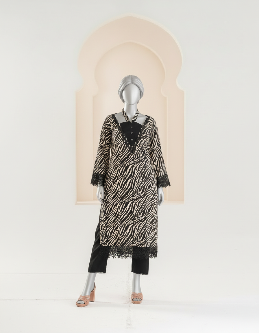 Bold yet sophisticated, this black and white linen zebra-print two-piece redefines modern elegance. The outfit features a stylish embellished neckline with fine detailing and chic button accents. Crafted with precision stitching and thoughtful design, it exudes a perfect balance of trend and timelessness, ideal for both casual chic and semi-formal occasions.
